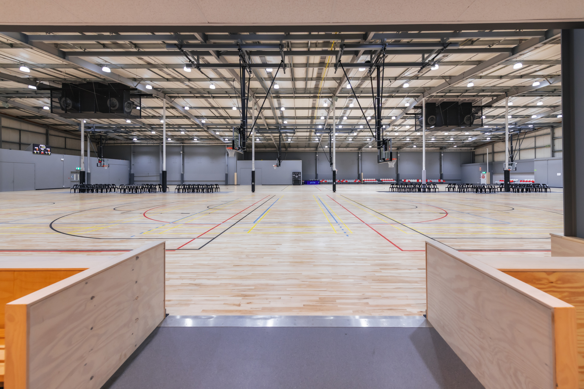 The centre also features seating for 1,500 spectators, 220 parking spaces (including underground), and full accessibility throughout. The flooring is premium Canadian maple hardwood, installed to international standards.